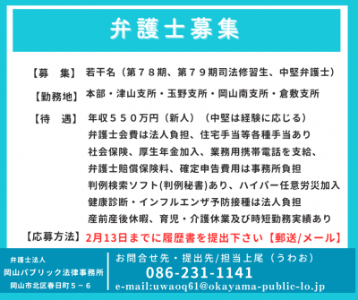 岡山パブリック法律事務所では、現在、共に働いていただける仲間(弁護士)を募集しております。